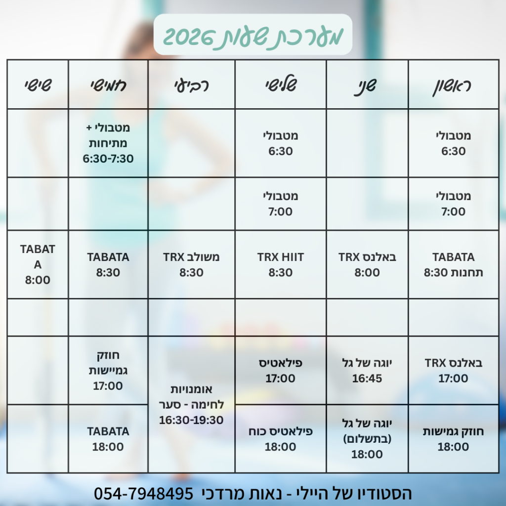 אני היילי לוינסקי, בעלת "הסטודיו של היילי" בקיבוץ נאות מרדכי. מאמנת כושר ויועצת לאורח חיים בריא עם ניסיון של מעל 20 שנה, ובעלת תואר ראשון במנהל עסקים. אני גם אמא לנדב, וזה מזכיר לי כל יום כמה חשוב לבנות שגרה שמחזיקה אותנו לאורך זמן, לא רק לרגע.